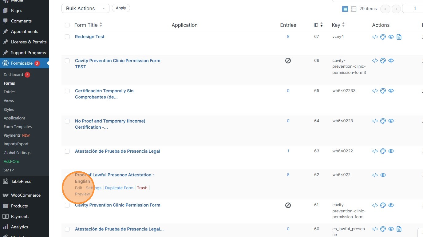 Section titled “2. This is where forms are created and edited.”To edit a form, click the edit button underneath. More information on the form builder is available from Formidable.