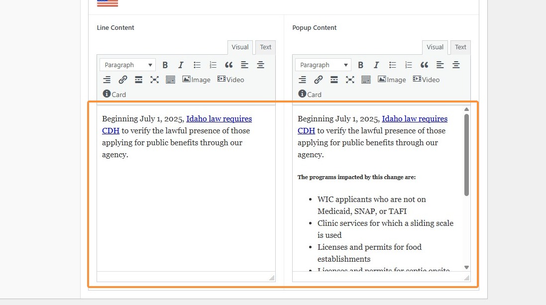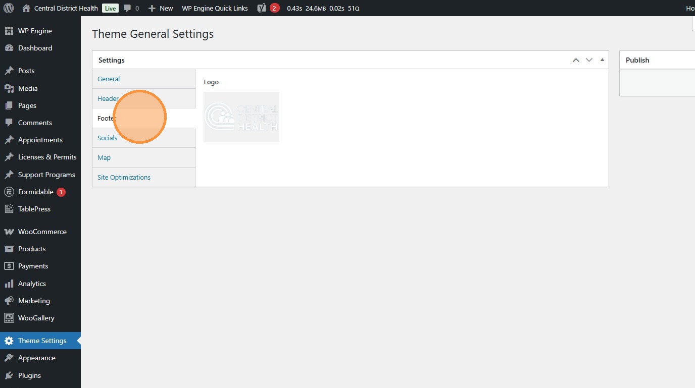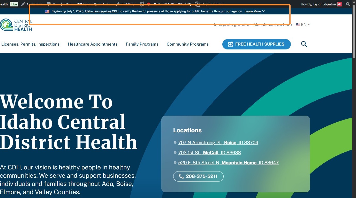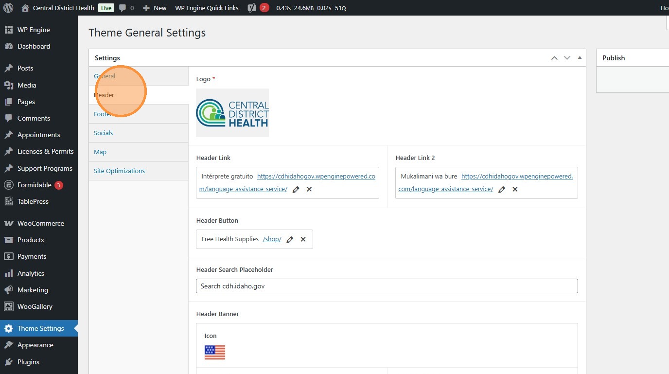 Section titled “1. Navigate to https://cdh.idaho.gov/wp-admin/ and click “Theme Settings””This allows us to make quick adjustments to the global website template.