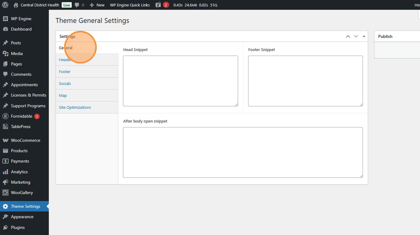 2. General settings include fields for adding scripts to the header and footer. Google Analytics tags are kept here, for example.