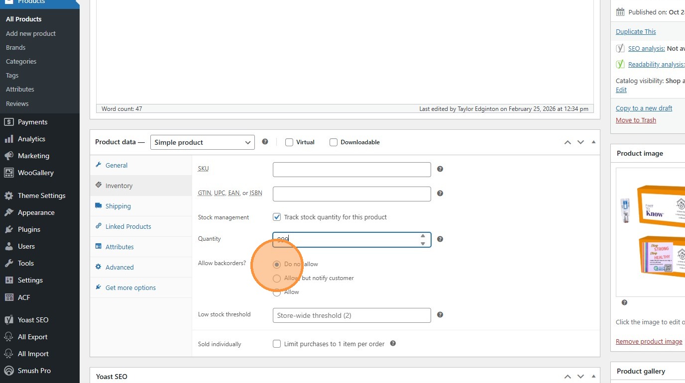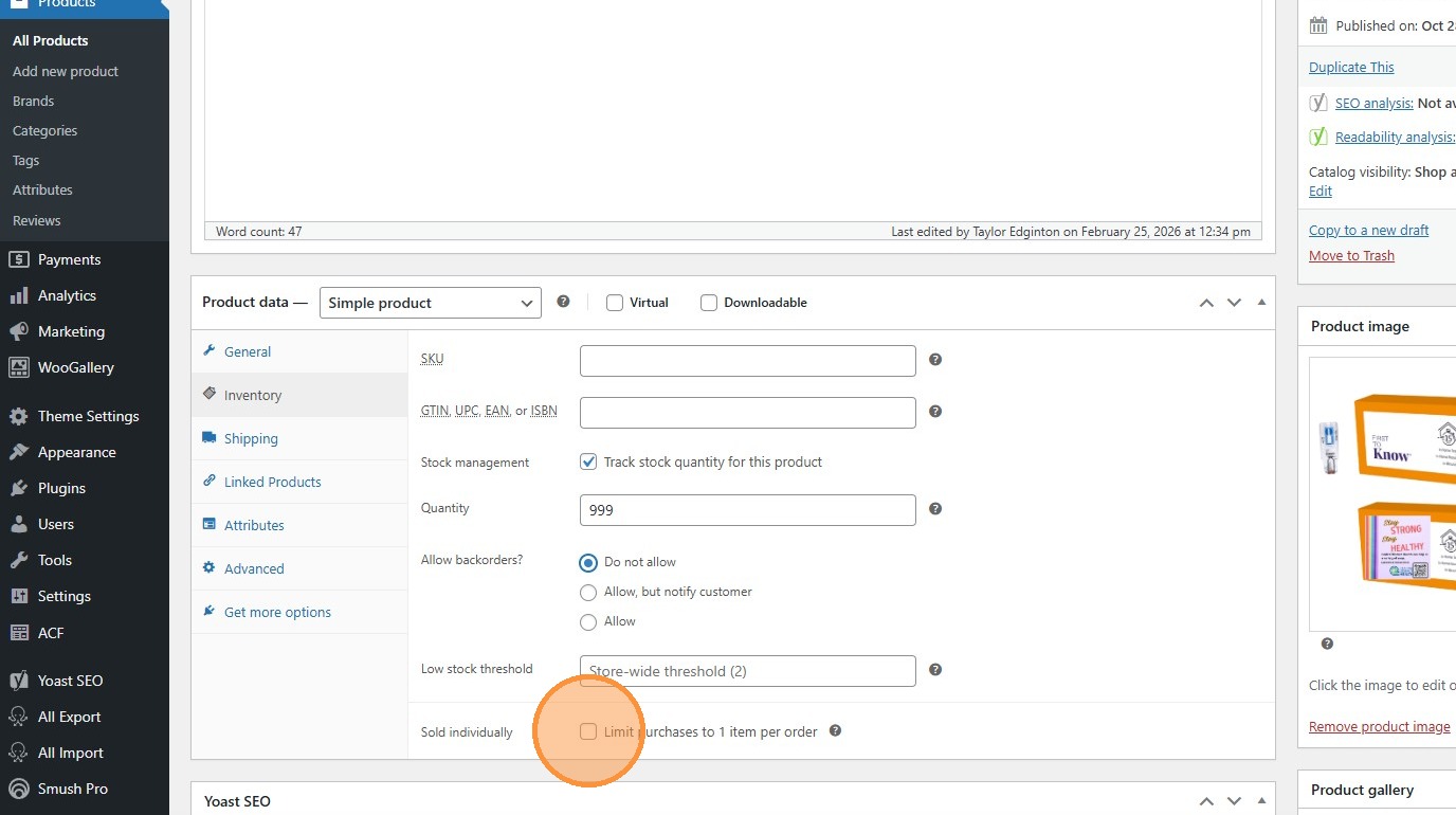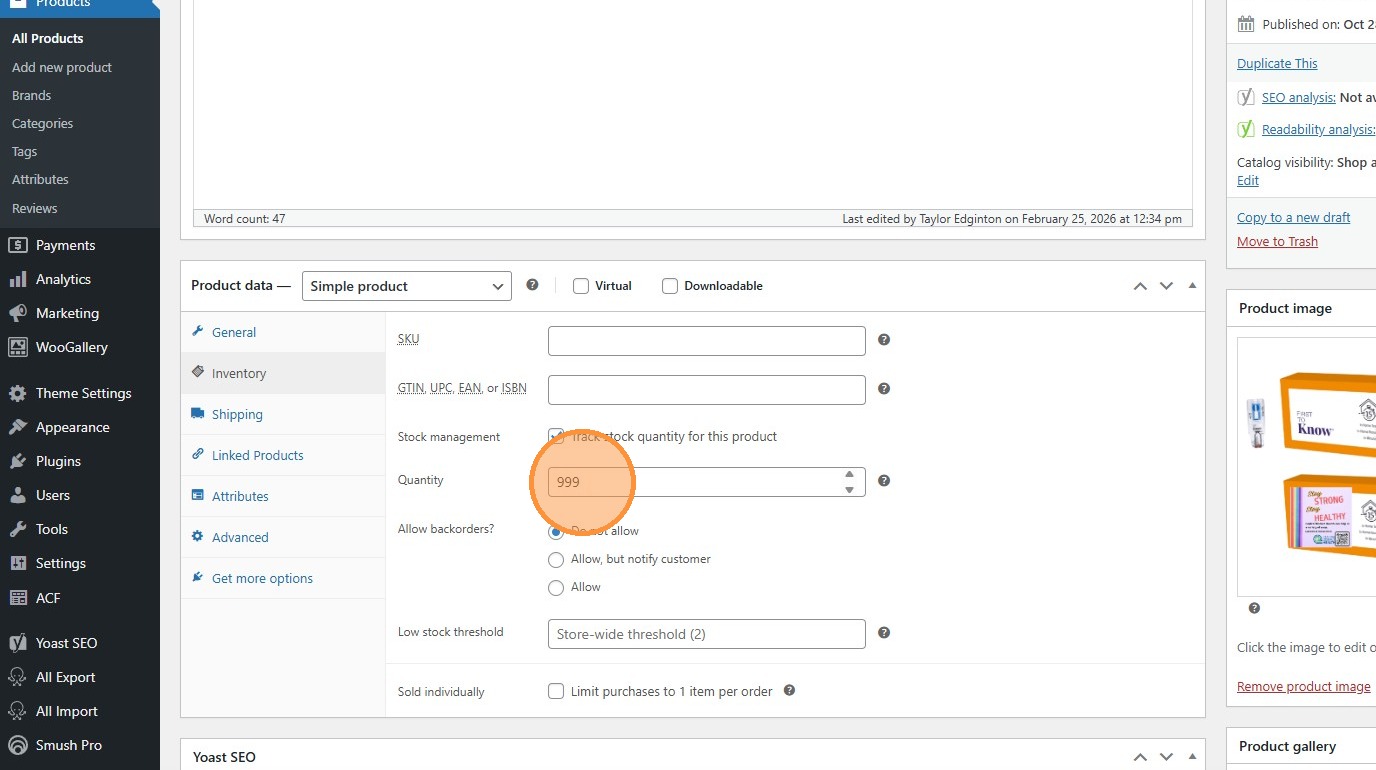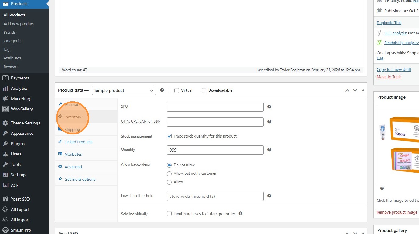 Section titled “6. Click “Inventory” to show some often-useful attributes. More info on this tab from WooCommerce.”
