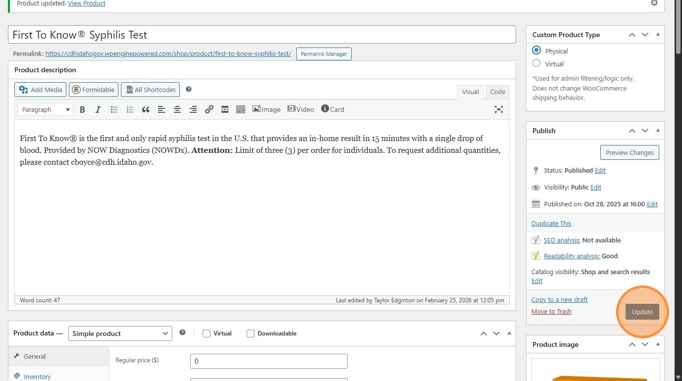 Section titled “10. Click “Update” to publish changes to the live site.”Other information about editing WooCommerce products can be found here.
