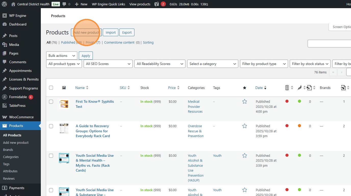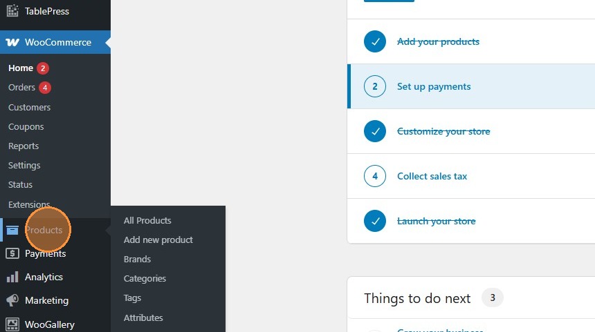 Section titled “1. Products on this site are managed with the WooCommerce plugin.”In order to manage products, navigate to the Products tab, just below the WooCommerce tab in Wordpress.